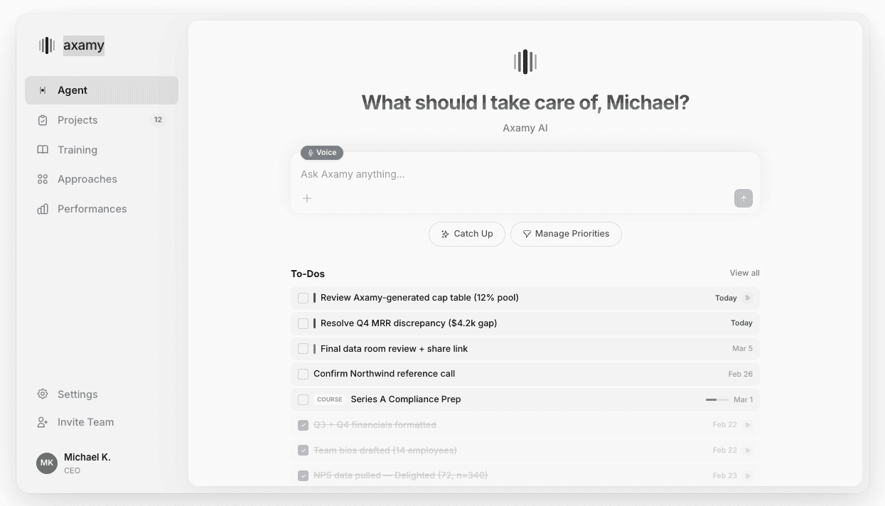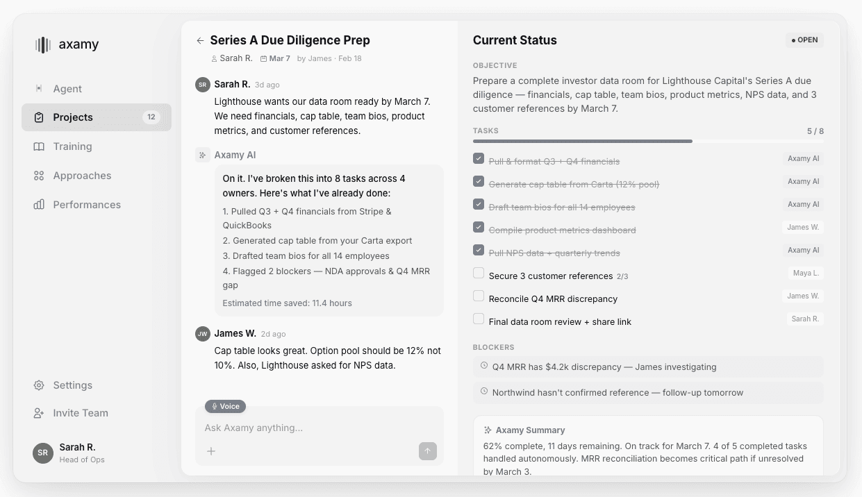 Axamy orchestrates work autonomously — assigning, sequencing, and adjusting tasks without waiting to be asked. It doesn't just track progress, it drives it.